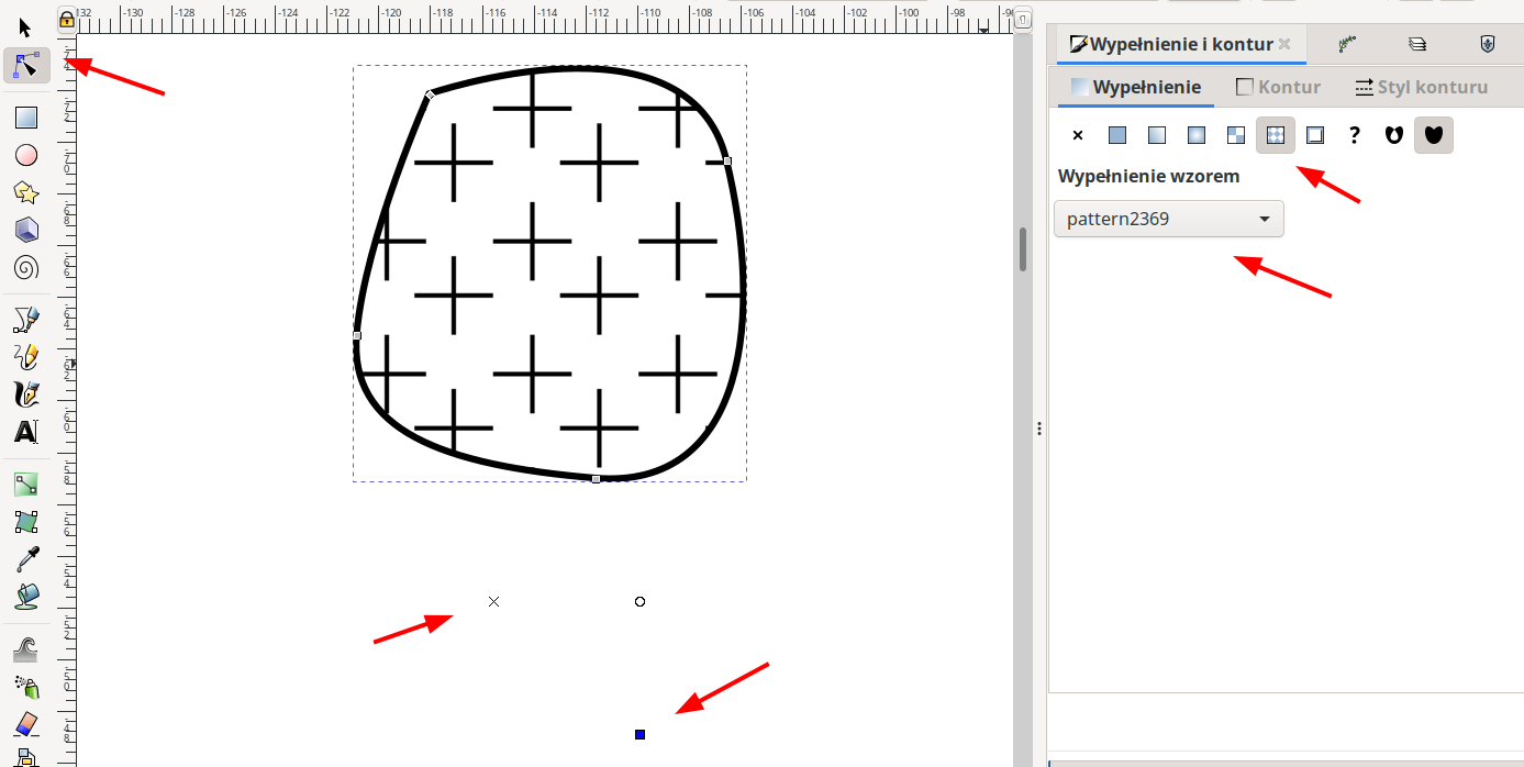 Zazwyczaj deseń ma nie taką skalę jak chcemy. Aby to naprawić, wybieramy narzędzie zaznaczania węzłów. Jeśli wybierzemy je dla obiektu wypełnionego deseniem, to poza edycją węzłów, przy pomocy charakterystycznych uchwytów (krzyżyk, kółko i prostokąt) będziemy mogli regulować sposób wypełnienia deseniem (uchwyty sterują odpowiednio: położeniem, obrotem i skalą). Skalować pewnie będziemy chcieli przytrzymując Ctrl (skalowanie proporcjonalne). Uwaga: uchwyty często są w niespodziewanym miejscu strony, często bardzo daleko od obiektu.