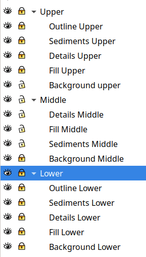 Nie należy mnożyć bytów ponad potrzebę. Za dużo warstw to same kłopoty. Ale wygląda na to, że z praktycznych przyczyn wypada mieć co najmniej trzy warstwy: wypełnienie kolorem środka jaskini (najniżej), szczegóły spągu (pośrodku), obrys korytarza (na górze). Powody są takie: