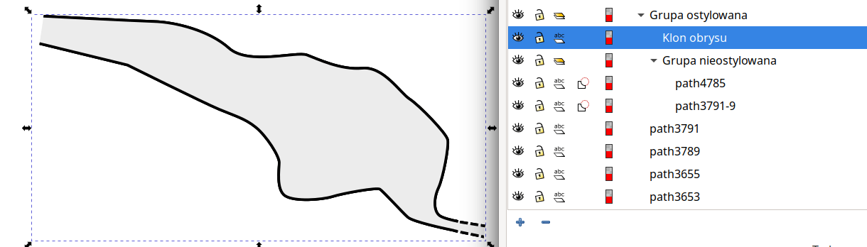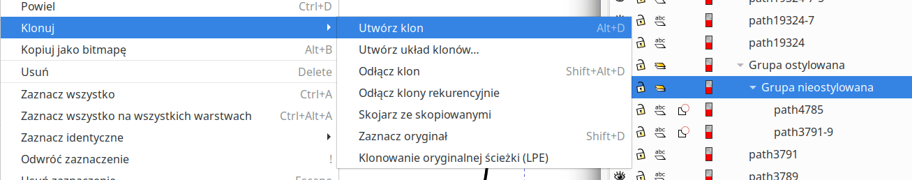 I teraz nastąpi czarna magia. Zaznaczamy Grupę nieostylowaną w dialogu Obiekt / Obiekty, a następnie z menu wybieramy Edycja / Klony / Utwórz klon. Na skutek tego ruchu na liście obiektów pojawia się nowa pozycja o nazwie rodzaju use24215. Możemy zmienić jej nazwę - nazwijmy ją na przykład Klon obrysu.