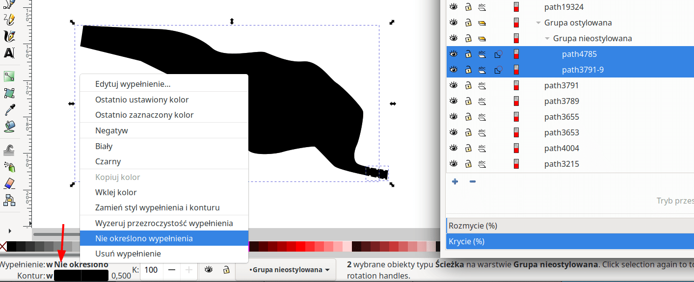 Teraz wchodzimy do grupy wewnętrznej (Nieostylowanej), klikając w dialogu Obiekt / Obiekty w którykolwiek z kształtów w tej grupie. Klikamy następie Ctrl+A, dzięki czemu zaznaczamy wszystkie kształty w grupie. Dalej w lewym dolnym rogu, w miejscu gdzie prezentowany jest kolor wypełnienia, klikamy prawym klawiszem. Z menu wybieramy Nie określono wypełnienia. Dla pewności wybieramy z listy obiektów również samą grupę Nieostylowaną i również ustawiamy jej wypełnienie typu Nie określono wypełnienia.