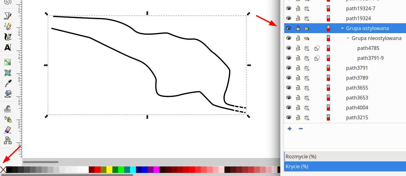 Teraz klikamy w dialogu Obiekt / Obiekty grupę "ostylowaną". Mając zaznaczoną tę grupę, ustawiamy brak wypełnienia (klikając X z palety kolorów).