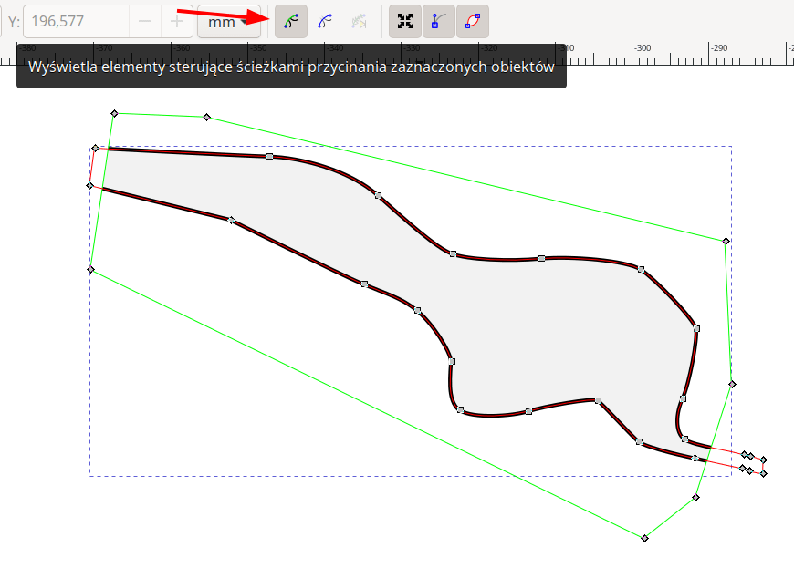 Zaznaczamy narysowany fragment jaskini oraz narysowaną maskę i wybieramy Obiekt / Przytnij / Ustaw. Tak nałożoną maskę przycinania można łatwo edytować przy pomocy narzędzia edycji węzłów, o ile zaznaczy się ikonkę Wyświetla elementy sterujące ścieżkami przycinania zaznaczonych obiektów
