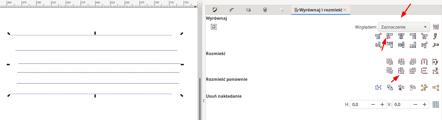 Przykład siatki dobrze demonstruje narzędzia do precyzyjnego przesuwania i rozmieszczania w Inkscape. Aby narysować bez rozszerzeń siatkę, robimy tak: